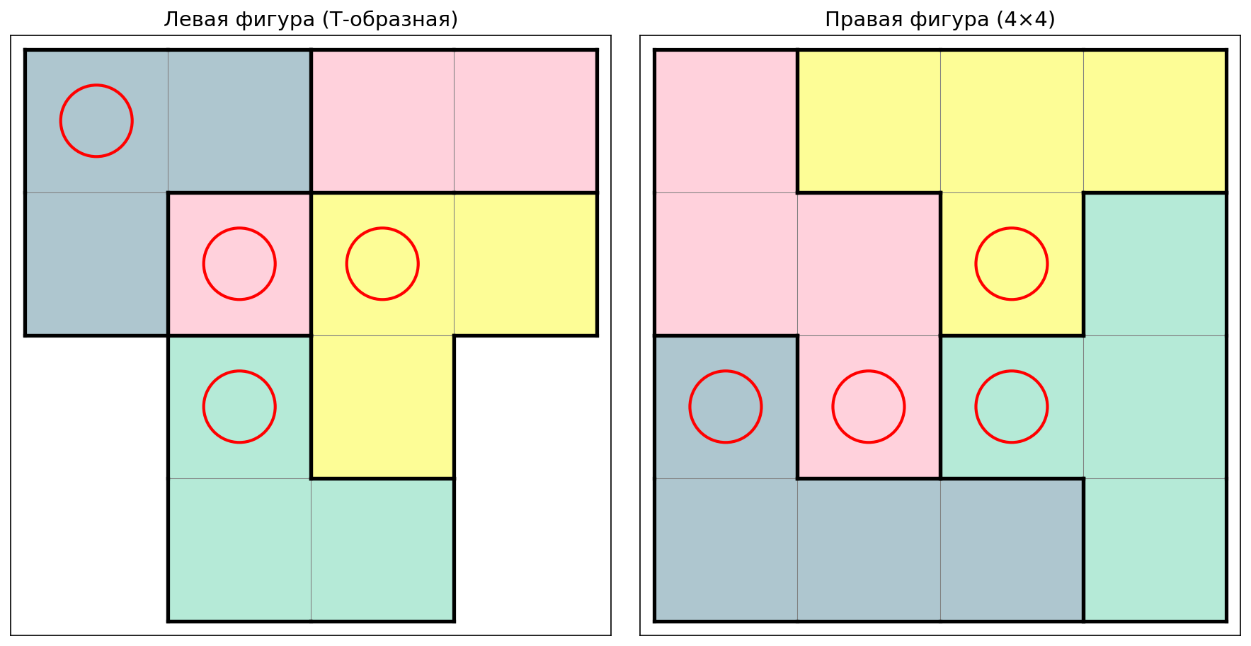 Правая фигура (16 клеток → 4 части по 4 клетки):