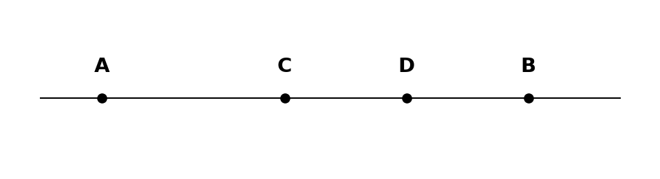 Таким образом, точки на прямой расположены в порядке: A, C, D, B.