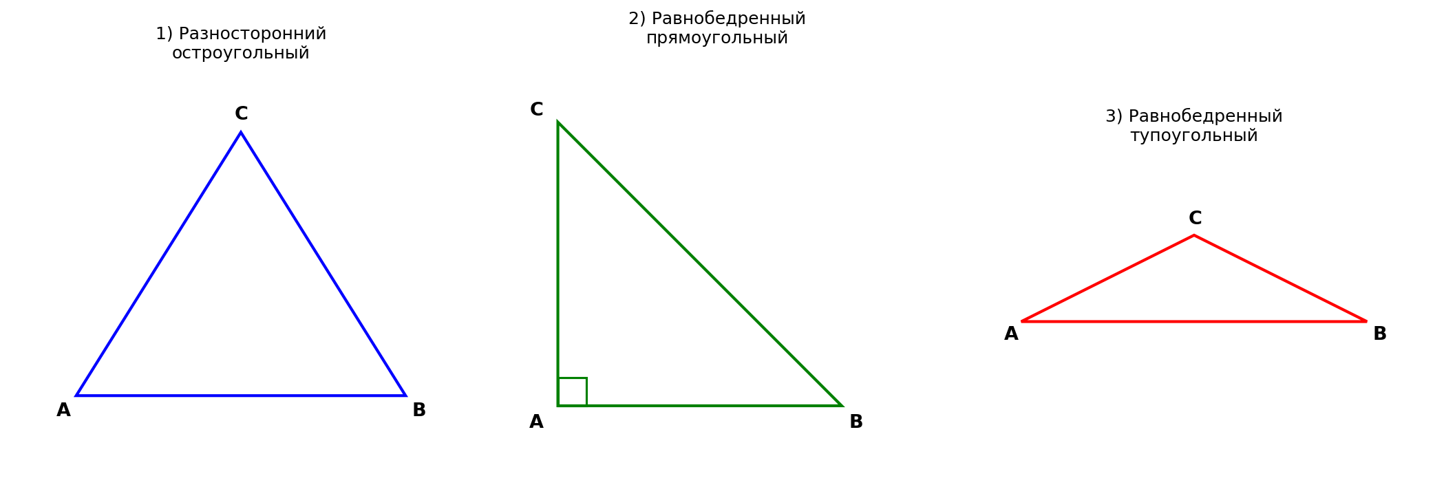 3) Равнобедренный тупоугольный треугольник — две стороны равны (боковые), один угол тупой (больше 90°).
