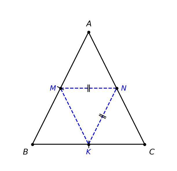 Таким образом, треугольник MNK — равнобедренный (две его стороны MN и KN равны).