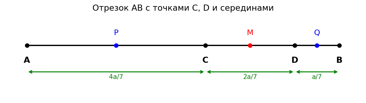 Условие: Точки $C$ и $D$ разделили отрезок $AB$, длина которого равна $a$, на три отрезка $AC$, $CD$ и $DB$ так, что $AC = 2CD$, $CD = 2DB$. Найдите расстояние между: