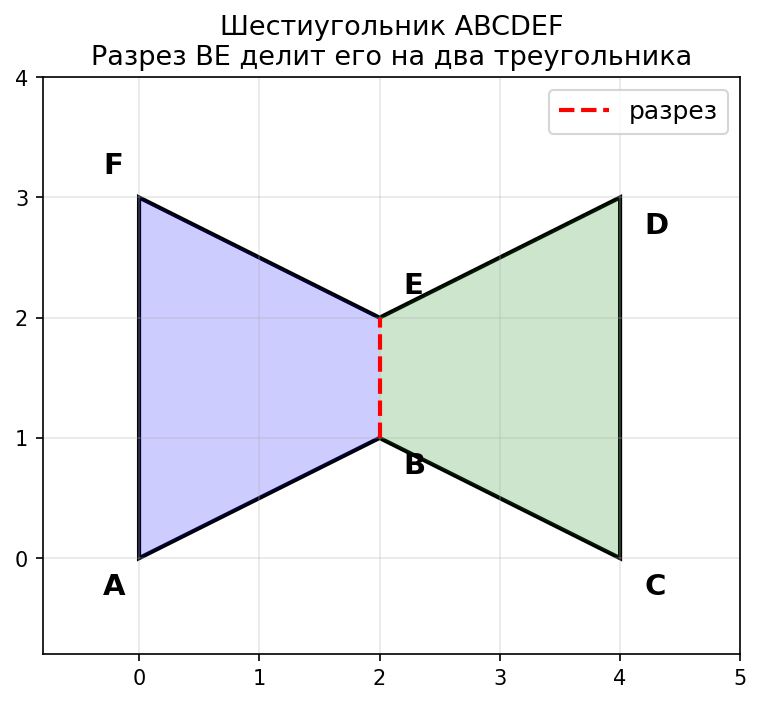 Уточним: при B=(2,1), E=(2,2) разрез BE делит шестиугольник на четырёхугольники. Подберём точки так, чтобы получились именно треугольники: нужно, чтобы A, B, F лежали на одной прямой и C, D, E — на одной прямой. Тогда ABCDEF — шестиугольник, а разрез даёт треугольники ABF и CDE.