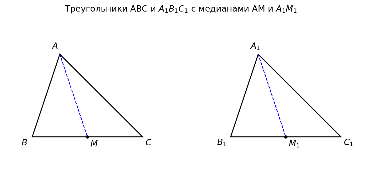 Теорема. Если две стороны и медиана, проведённая к третьей стороне, одного треугольника равны соответственно двум сторонам и медиане, проведённой к третьей стороне, другого треугольника, то такие треугольники равны.