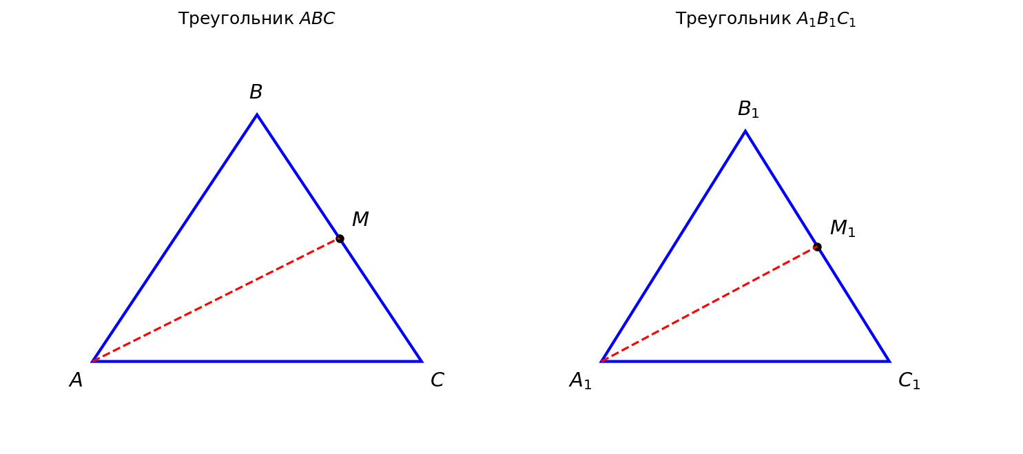Теорема. Если боковая сторона и медиана, проведённая к боковой стороне одного равнобедренного треугольника, равны соответственно боковой стороне и медиане, проведённой к боковой стороне другого равнобедренного треугольника, то эти треугольники равны.
