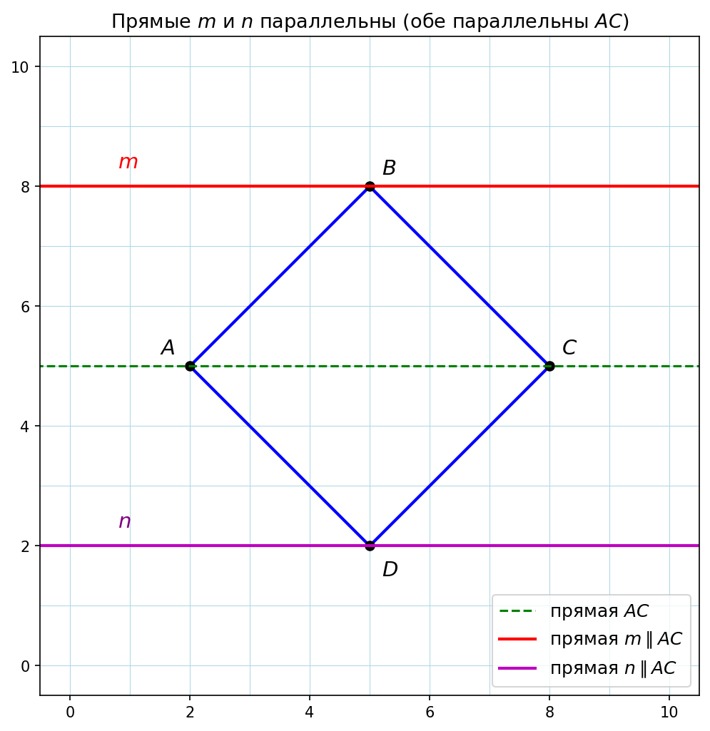 Проведём через точку B прямую m, параллельную прямой AC, и через точку D прямую n, параллельную прямой AC.