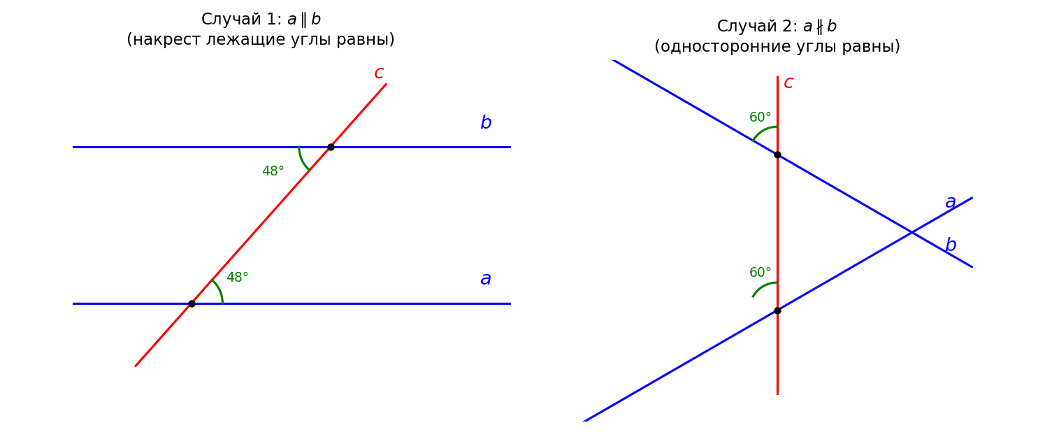 Если равные углы являются накрест лежащими, то по теореме 14.1 прямые a ∥ b.