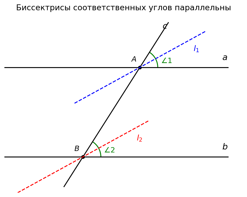 Условие: Докажите, что биссектрисы пары соответственных углов, образованных при пересечении двух параллельных прямых секущей, параллельны.