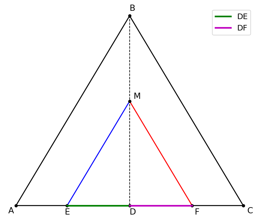 Треугольник ABC — равнобедренный с основанием AC, BD — биссектриса, точка M лежит на BD. Через точку M проведены прямые: ME ∥ AB и MF ∥ BC, где E и F — точки на отрезке AC.