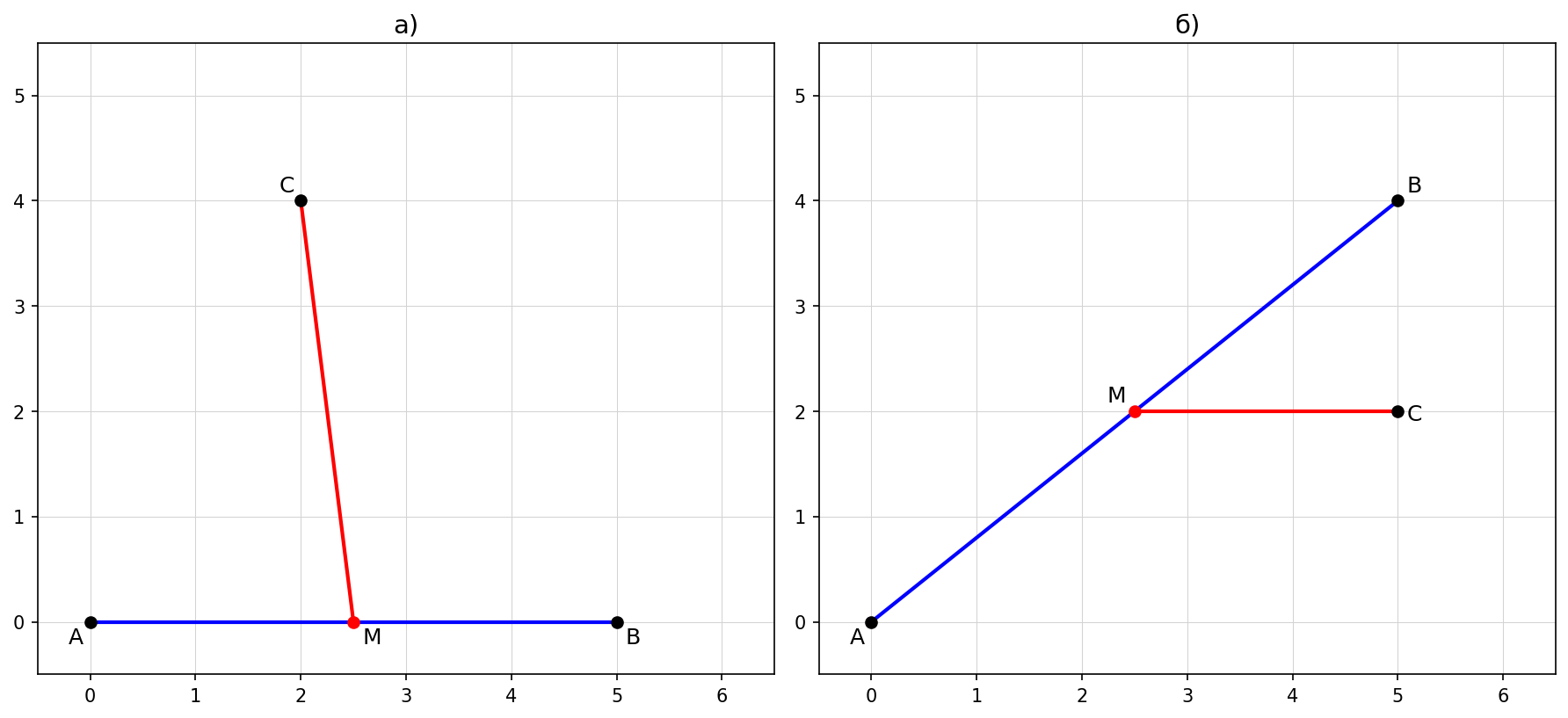 б) Клетчатая бумага, точка $A$ — левый нижний, точка $B$ — верхняя правая часть (на 5 клеток правее и на 4 клетки выше $A$), точка $C$ — правая часть, примерно на 5 клеток правее $A$ и на 2 клетки выше.