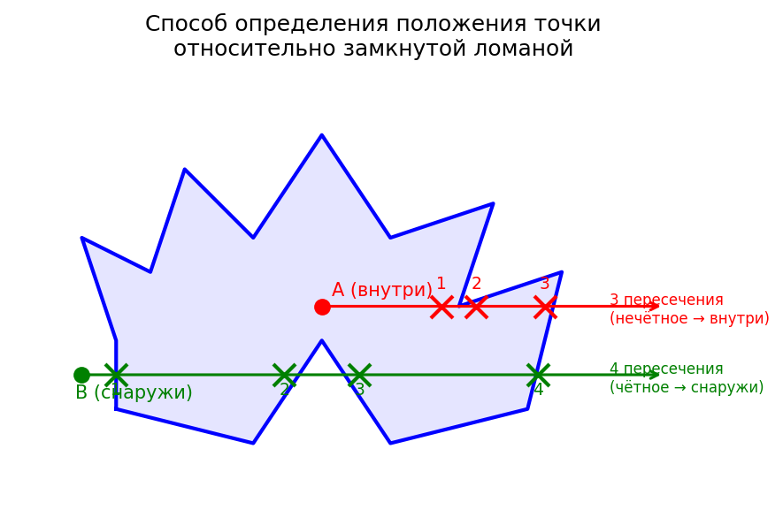 Объяснение. Каждое пересечение луча со стороной ломаной означает переход из внутренней области во внешнюю или наоборот. Луч начинается в нашей точке, а заканчивается заведомо вне ломаной (уходит в бесконечность). Значит, если луч пересёк границу нечётное число раз — он начался внутри; если чётное — снаружи.