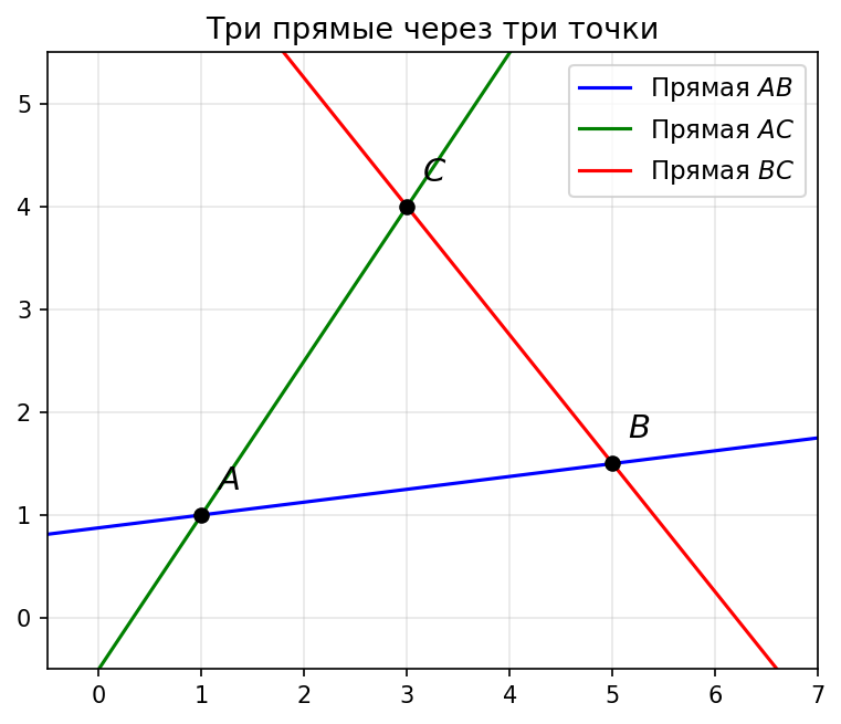 Условие: Отметьте три точки так, чтобы они не лежали на одной прямой, и через каждую пару точек проведите прямую. Сколько образовалось прямых?
