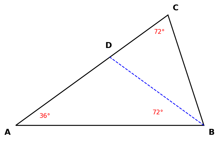 Треугольник ABD: углы 36°, 36°, 108° — равнобедренный (BD = AD) ✓