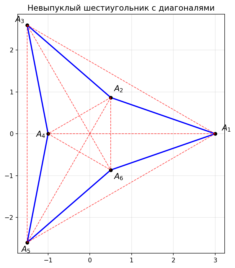Возьмём невыпуклый шестиугольник, вершины которого чередуются — далеко и близко от центра (звёздчатая форма). В таком шестиугольнике диагонали, соединяющие «дальние» вершины, проходят через центральную область, но при подходящем выборе вершин можно добиться, чтобы они не пересекались внутри шестиугольника (часть диагоналей проходит вне фигуры).