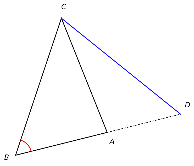 Рассмотрим треугольник ABC, у которого угол B тупой. Точка D лежит на продолжении стороны AB за точку A (рис.).