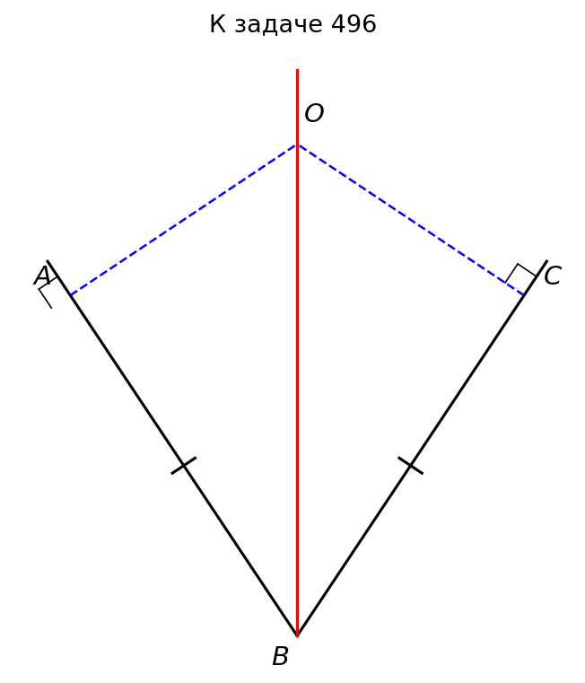 Условие: На сторонах угла с вершиной в точке $B$ отметили точки $A$ и $C$ так, что $AB = BC$. Через точки $A$ и $C$ провели прямые, перпендикулярные сторонам $BA$ и $BC$ соответственно, которые пересекаются в точке $O$. Докажите, что луч $BO$ — биссектриса угла $ABC$.