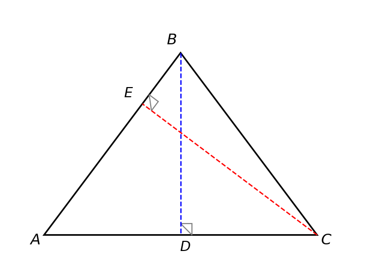 Рассмотрим треугольник ABC, в котором высоты BD и CE равны, где D — основание высоты из вершины B на сторону AC, а E — основание высоты из вершины C на сторону AB (рис.).