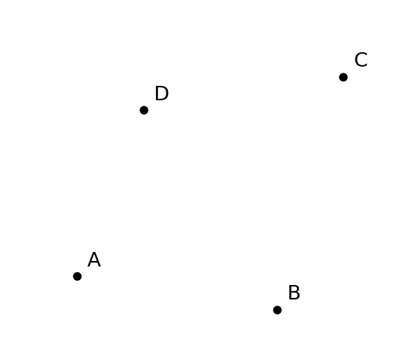 Отметим четыре точки A, B, C, D так, чтобы никакие три из них не лежали на одной прямой. Для этого достаточно расположить их, например, в вершинах четырёхугольника.
