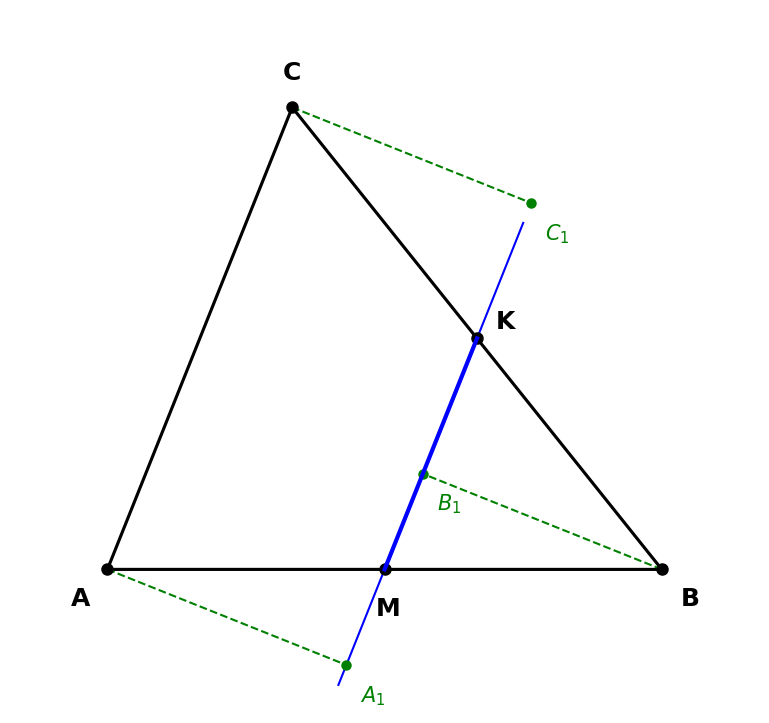 Условие: Прямая пересекает стороны $AB$ и $BC$ треугольника $ABC$ соответственно в точках $M$ и $K$, являющихся серединами этих сторон. Докажите, что вершины данного треугольника равноудалены от прямой $MK$.
