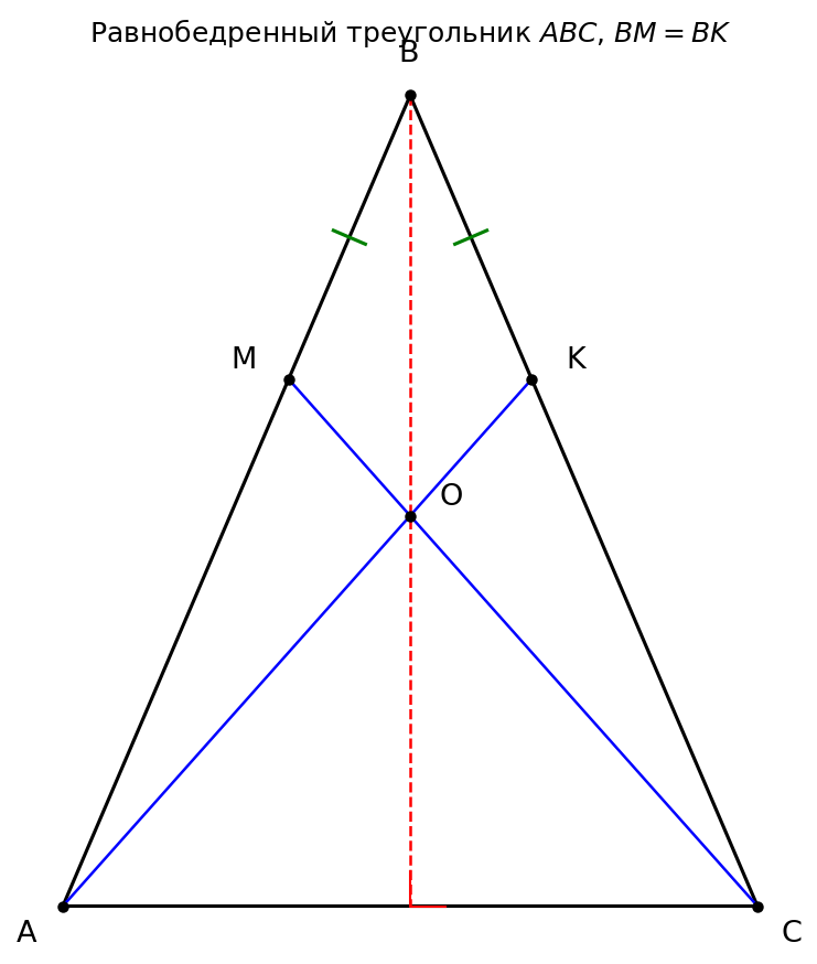 Дано: △ ABC — равнобедренный, AB = BC; точки M ∈ AB, K ∈ BC, BM = BK; отрезки AK и CM пересекаются в точке O.