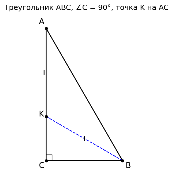 Дано: Треугольник ABC, ∠ C = 90°, точка K на катете AC, AK = BK, AK = 6 см, KC = 3 см.