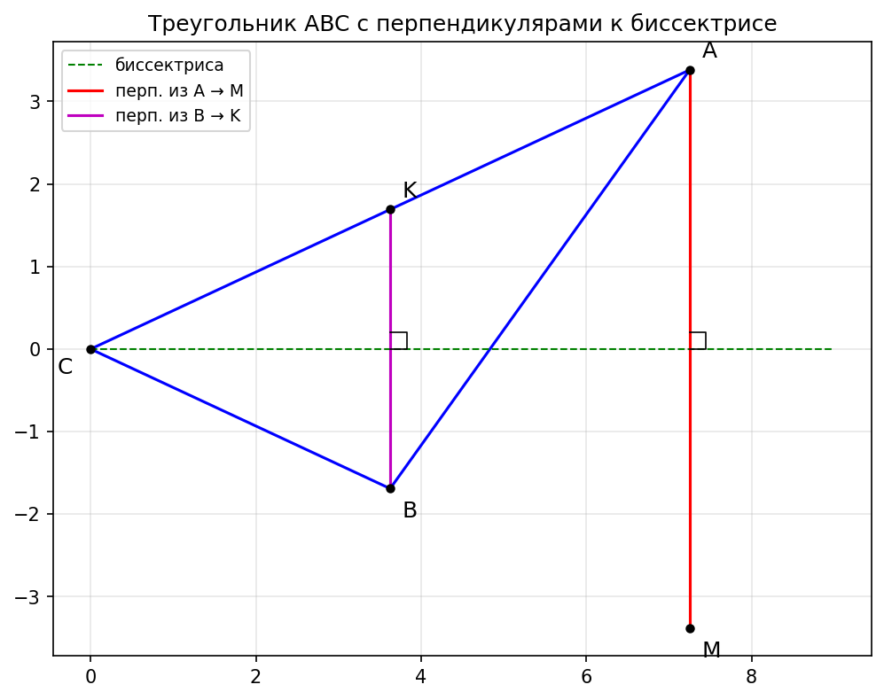 Ладно, попробуем ещё одну интерпретацию: прямая через A ⊥ биссектрисе пересекает прямую BC в K, а прямая через B ⊥ биссектрисе пересекает прямую AC в M (т.е. M и K наоборот).