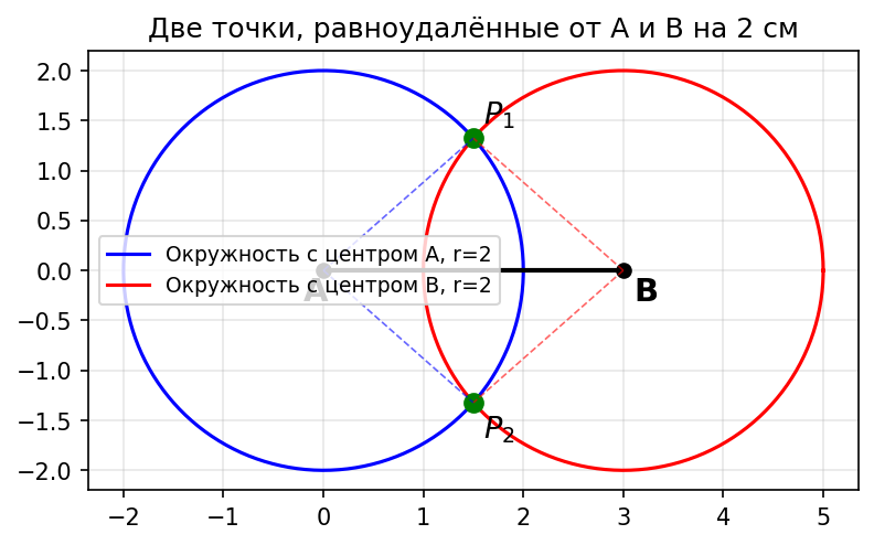 Нам нужно найти точки, удалённые от точки A на 2 см и одновременно от точки B на 2 см, где AB = 3 см.