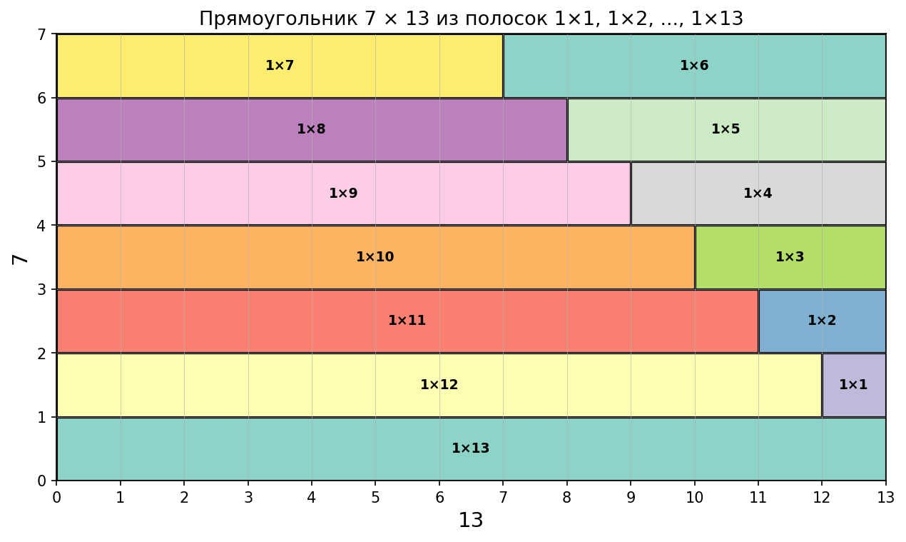 Нам даны 13 прямоугольников размерами 1 × 1, 1 × 2, 1 × 3, …, 1 × 13.