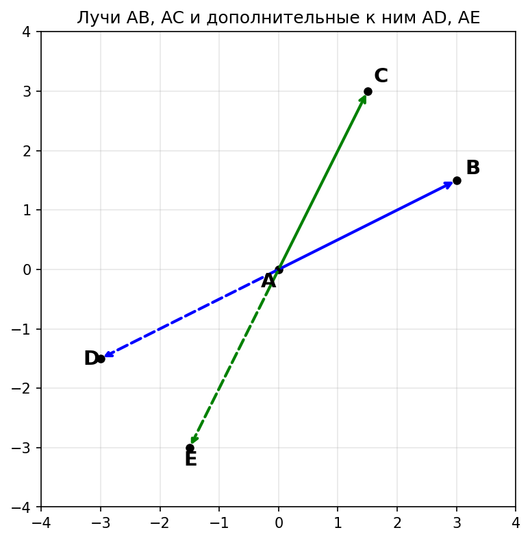 Дополнительные лучи: AB и AD, AC и AE.