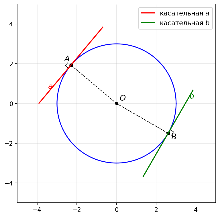 Аналогично через точку B проведём прямую b, перпендикулярную радиусу OB. По теореме 21.4 прямая b — касательная к окружности в точке B.