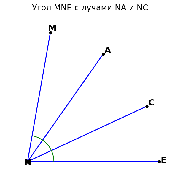 Условие: Начертите угол $MNE$ и проведите лучи $NA$ и $NC$ между его сторонами. Запишите все образовавшиеся углы.