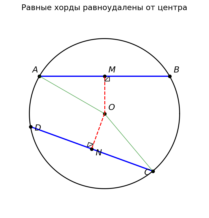 Проведём из центра O перпендикуляры OM и ON на хорды AB и CD соответственно (M — основание перпендикуляра на AB, N — основание перпендикуляра на CD). Расстояния от центра до хорд — это длины отрезков OM и ON.