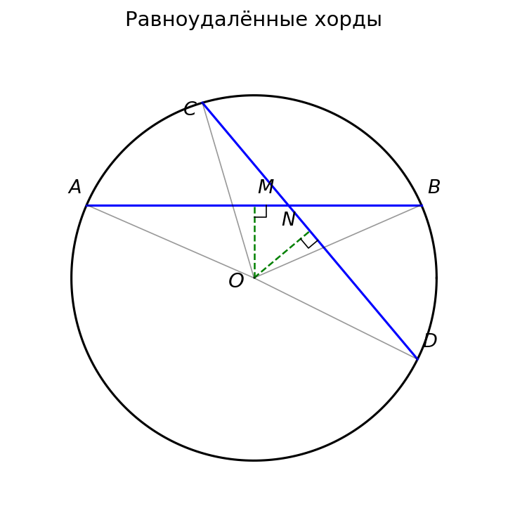 Пусть дана окружность с центром O и радиусом r. Хорды AB и CD равноудалены от центра, т. е. OM = ON, где OM ⊥ AB, ON ⊥ CD, M и N — основания перпендикуляров (рис.).