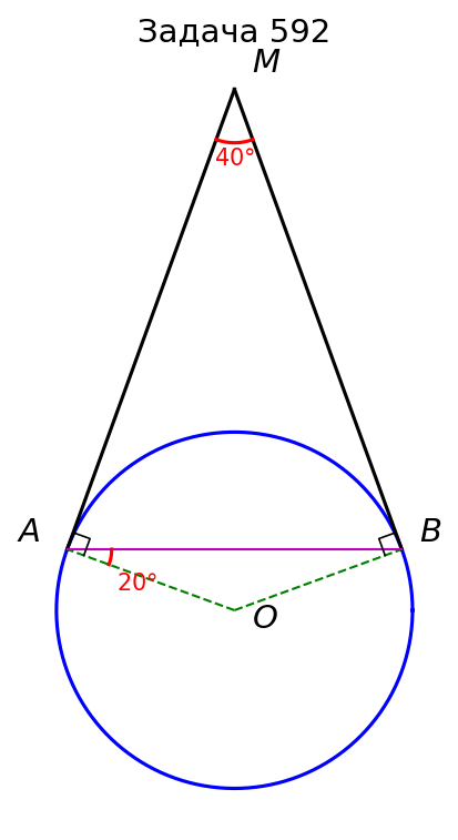 Условие: Через точку $M$ к окружности с центром $O$ провели касательные $MA$ и $MB$, $A$ и $B$ — точки касания, $\angle OAB = 20°$. Найдите угол $AMB$.