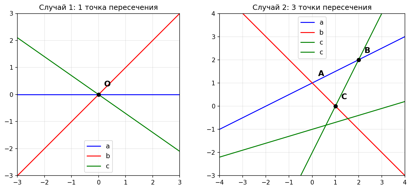 Тогда прямые a и b пересекаются в точке A, прямые a и c — в точке B, прямые b и c — в точке C. По теореме 1.1 каждые две пересекающиеся прямые имеют только одну общую точку, поэтому точки A, B, C — различные. Точек пересечения три.