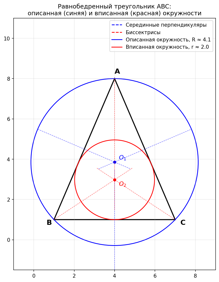 (вписанной окружности) — лежат на оси симметрии треугольника, то есть на серединном перпендикуляре основания BC, который одновременно является биссектрисой угла A и медианой из вершины A.