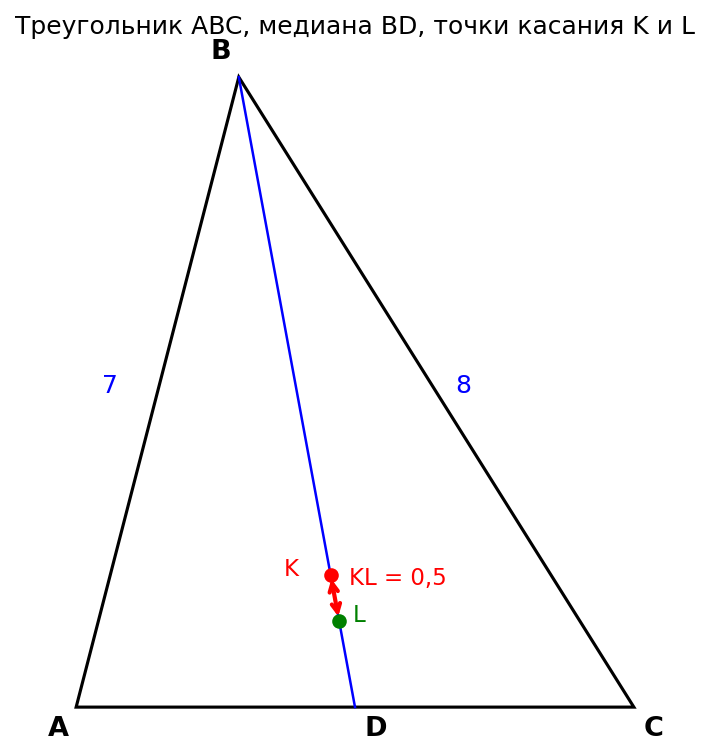 Для треугольника ABD со сторонами AB = 7, BD и AD вписанная окружность касается стороны BD в точке K. По свойству касательных, проведённых из одной точки к окружности, обозначим: