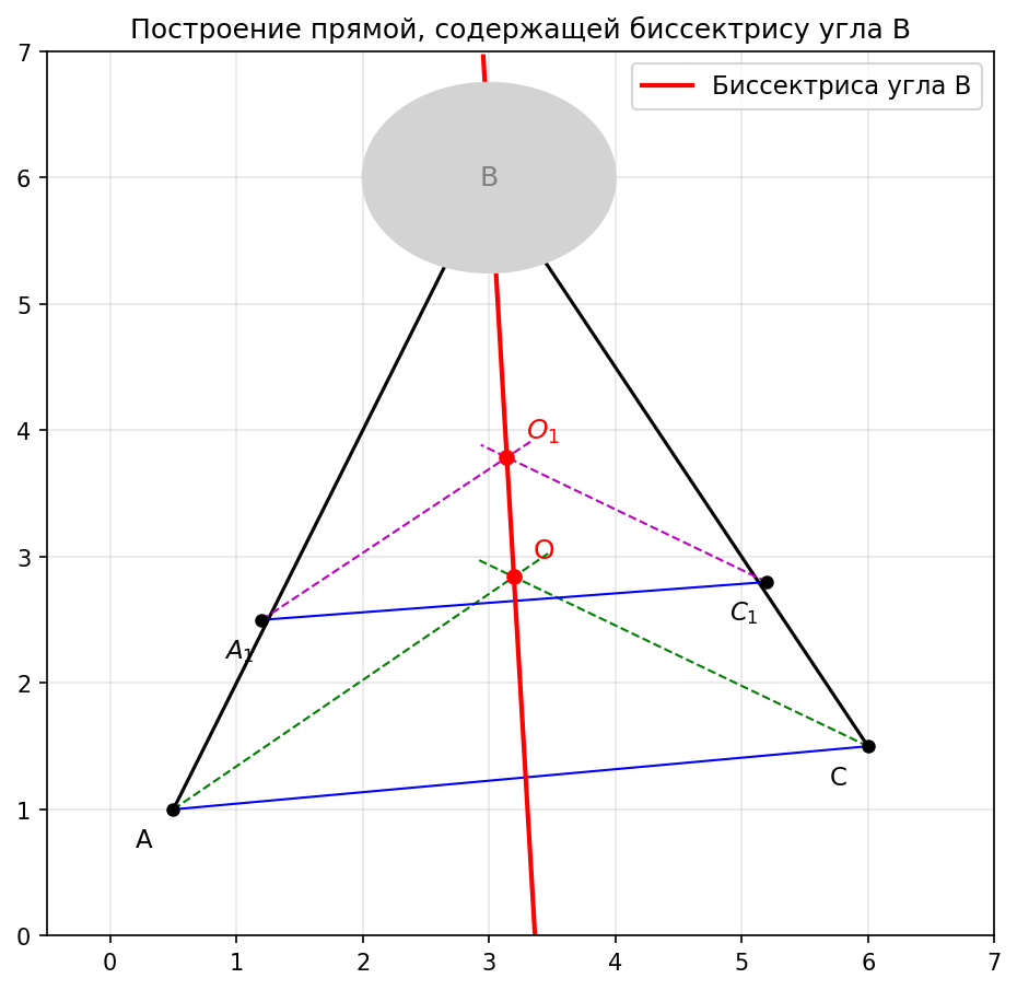 Поскольку вершина угла B недоступна, мы не можем непосредственно провести биссектрису из точки B. Воспользуемся свойством вписанной окружности треугольника.