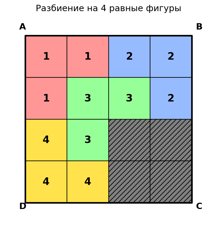 Каждая из четырёх фигур (обозначенных номерами 1, 2, 3, 4) состоит из трёх клеток и имеет форму уголка (Г-образная фигура). Все четыре фигуры равны между собой, так как каждая представляет собой одинаковый уголок из трёх клеток и может быть совмещена с любой другой поворотом.