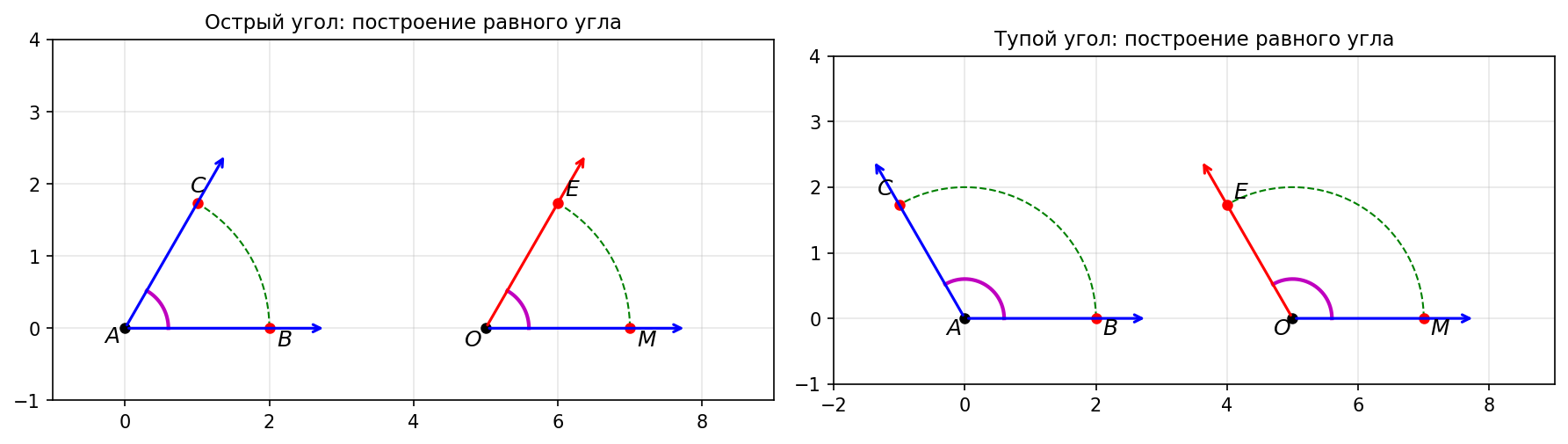 Доказательство: В треугольниках ABC и OEM: AB = OE = r, AC = OM = r, BC = ME (по построению). По третьему признаку равенства треугольников △ ABC = △ OEM, откуда ∠ EOM = ∠ BAC.