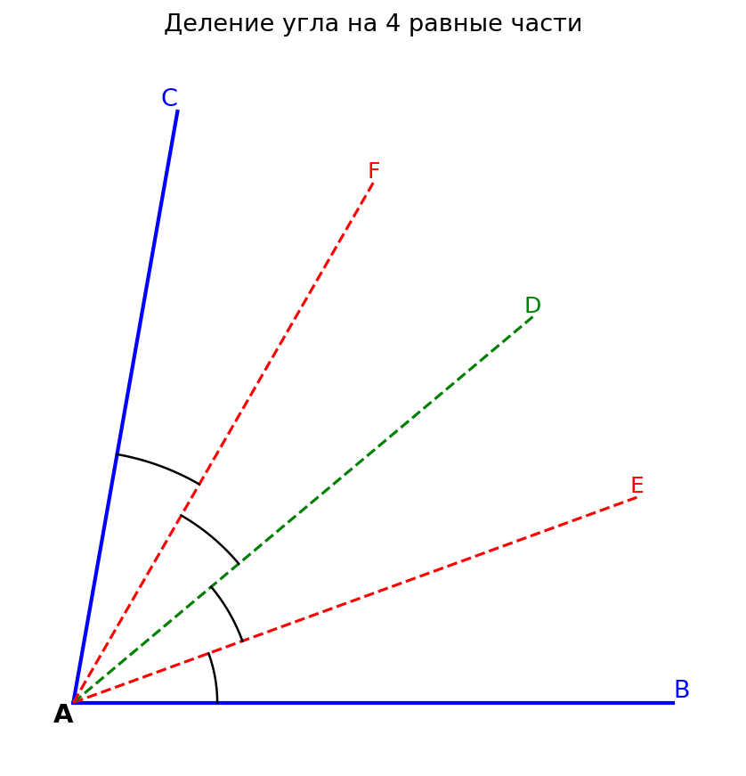Результат. Лучи AE, AD, AF делят угол BAC на четыре равные части: