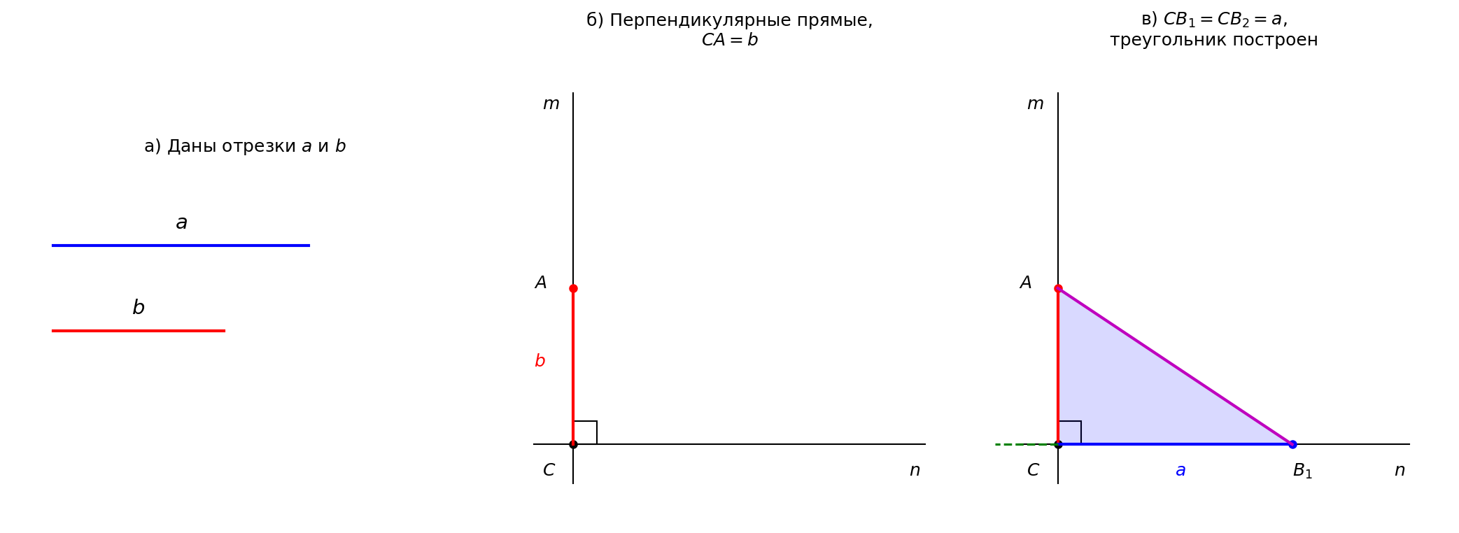 Проведём две перпендикулярные прямые m и n. Пусть C — точка их пересечения. На прямой m отложим отрезок CA, равный b. На прямой n отложим отрезок , равный a.