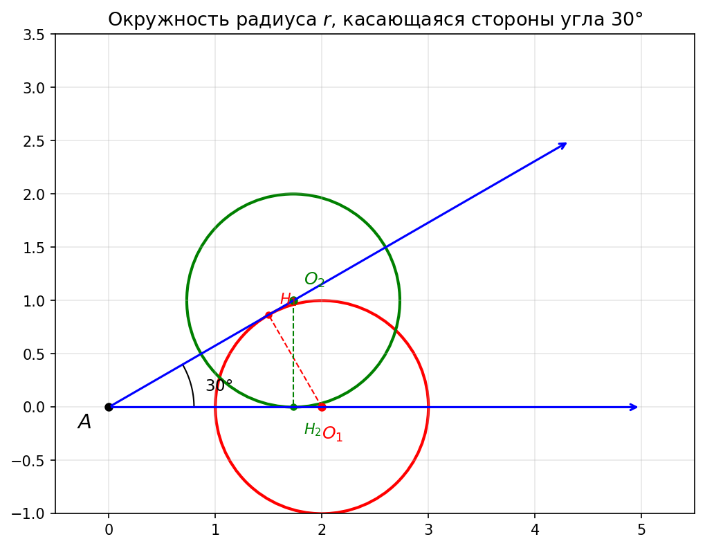 Решение. Пусть дан угол BAC = 30° и отрезок радиуса r. Надо построить окружность радиуса r с центром на одной стороне угла, касающуюся другой стороны.