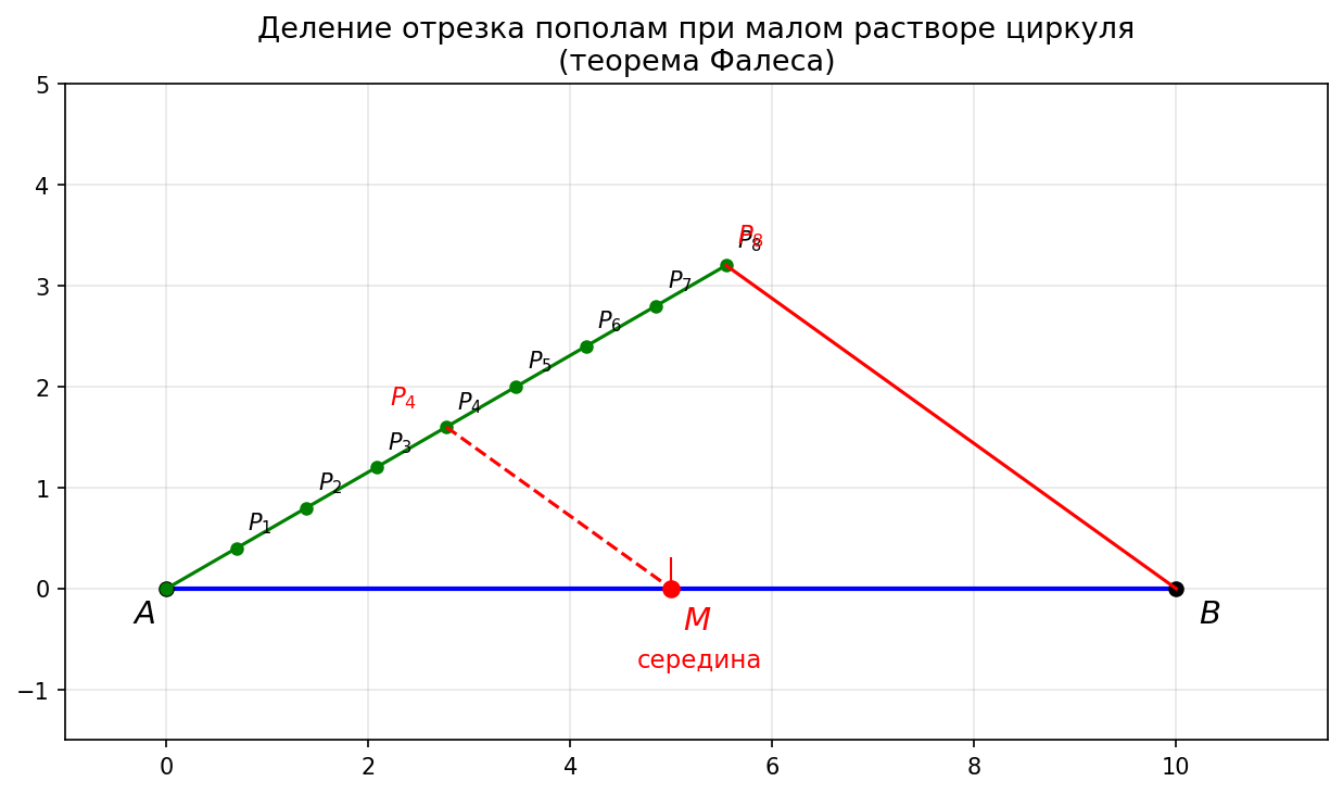 Идея состоит в том, чтобы свести задачу к построению серединного перпендикуляра, но поскольку мы не можем провести окружности радиуса из точек A и B (раствора циркуля не хватает), действуем иначе.