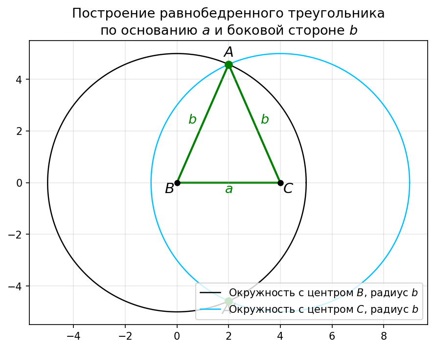 Полученный треугольник ABC является искомым, так как в нём BC = a, AB = AC = b, то есть треугольник равнобедренный с основанием a и боковой стороной b.