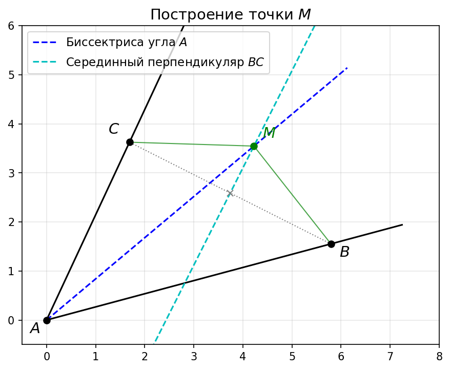 Точка M является искомой, так как она лежит на биссектрисе угла A (значит, равноудалена от его сторон и принадлежит углу) и лежит на серединном перпендикуляре отрезка BC (значит, MB = MC).