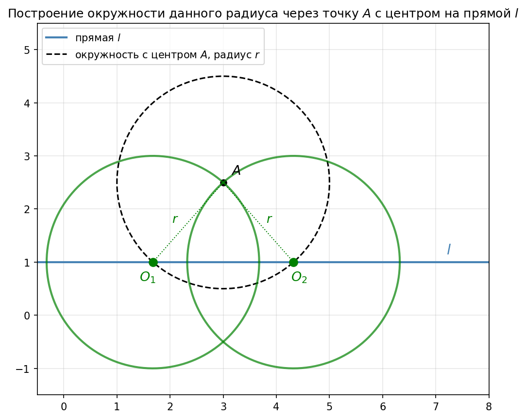 Условие: Постройте окружность данного радиуса, проходящую через данную точку, центр которой принадлежит данной прямой.