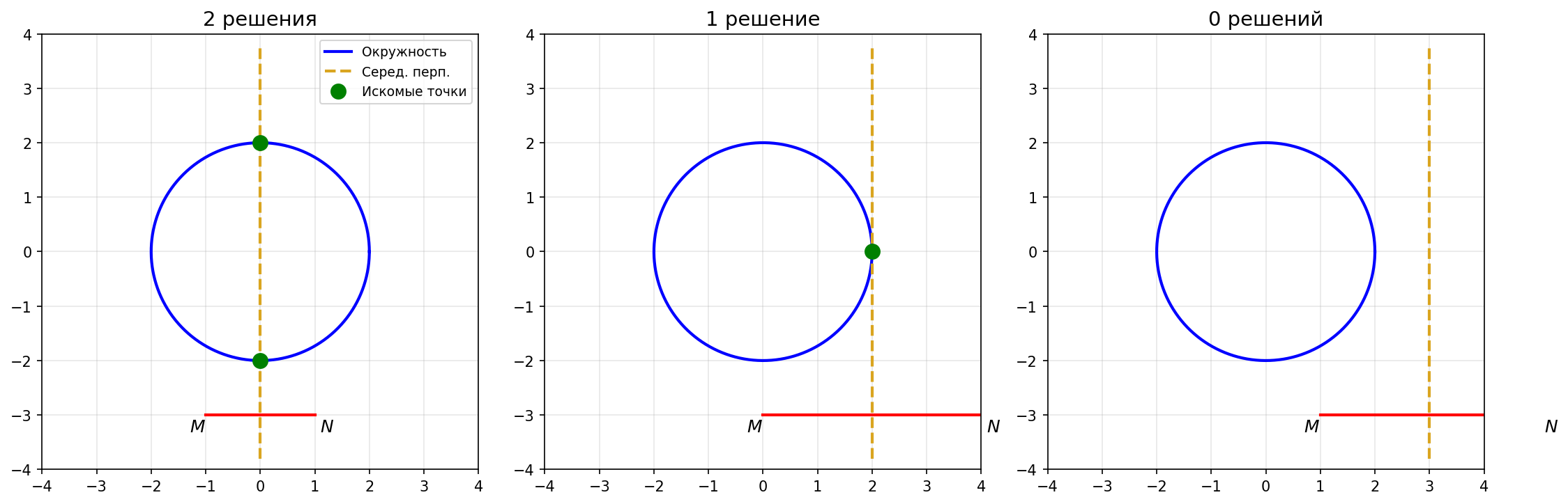 Таким образом, задача может иметь 0, 1 или 2 решения в зависимости от взаимного расположения серединного перпендикуляра к отрезку MN и данной окружности.