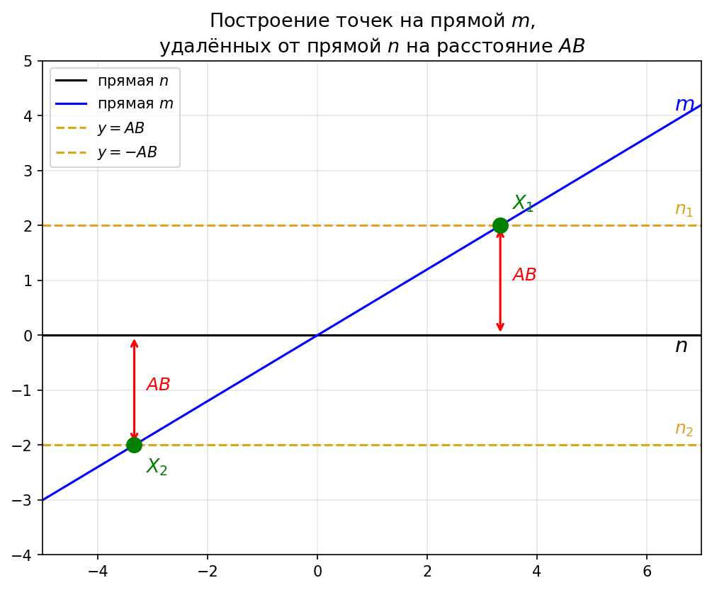 Ответ: задача имеет два решения — это две точки пересечения прямой m с двумя прямыми, параллельными n и проведёнными на расстоянии AB по обе стороны от неё.