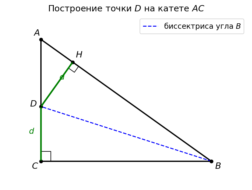Решение. Нам дан прямоугольный треугольник ABC с ∠ C = 90°. Нужно на катете AC найти точку D такую, что расстояние от D до прямой AB равно CD.