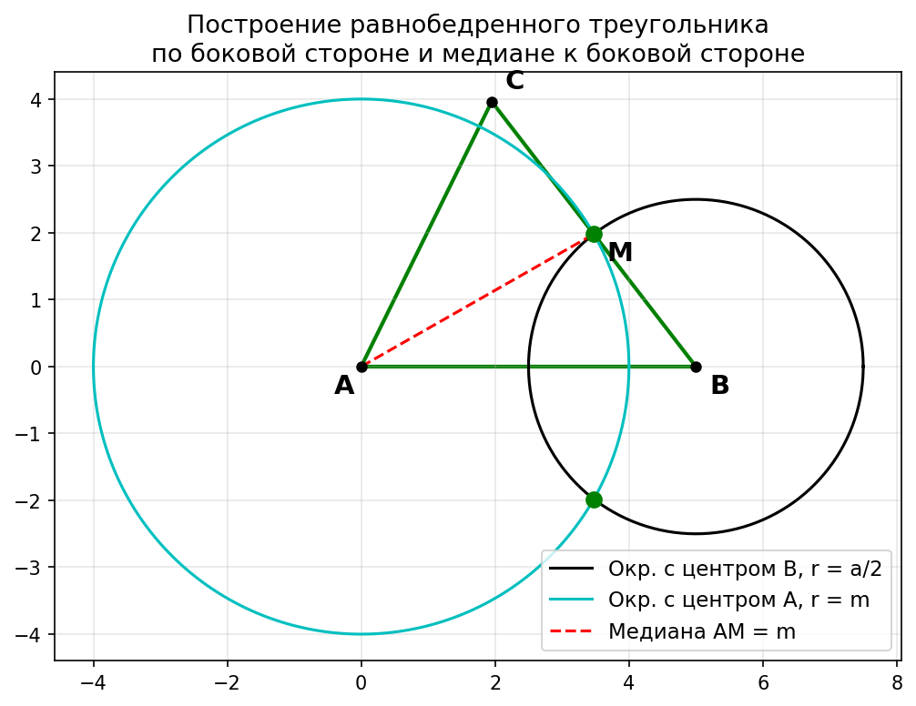 Нужно построить равнобедренный треугольник ABC, в котором AB = BC = a (боковые стороны), а AM — медиана, проведённая к боковой стороне BC, причём AM = m, где M — середина BC.